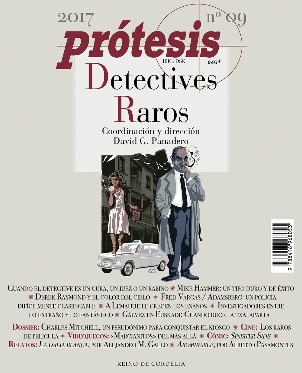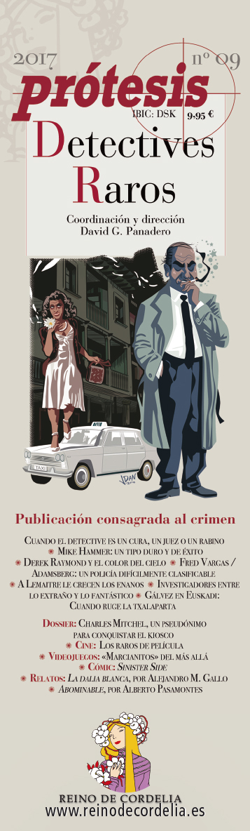 Prótesis, la publicación consagrada al crimen creada hace quince años por David G. Panadero, celebra su aniversario con un número especial dedicado a los Detectives raros de la literatura policíaca, el cine, los videojuegos y el cómic. Supone al mismo tiempo el primer número de la alianza entre Prótesis y Reino de Cordelia, que a partir de ahora se encarga de la edición en papel de esta publicación, siempre bajo la dirección de Panadero.